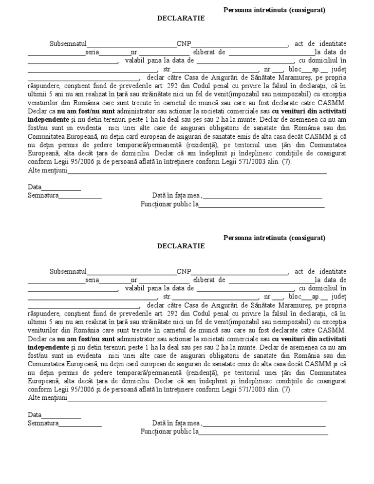 Declaratie Coasigurat Sanatate Model 2018