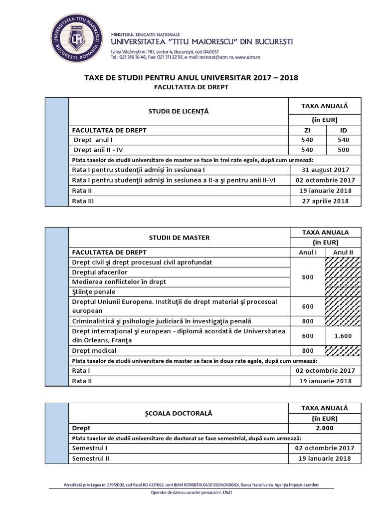 Taxe De Studii Pentru Anul Universitar 2017 2018 Facultatea De Drept Taxa Anuală In Eur Facultatea De Drept Zi Id