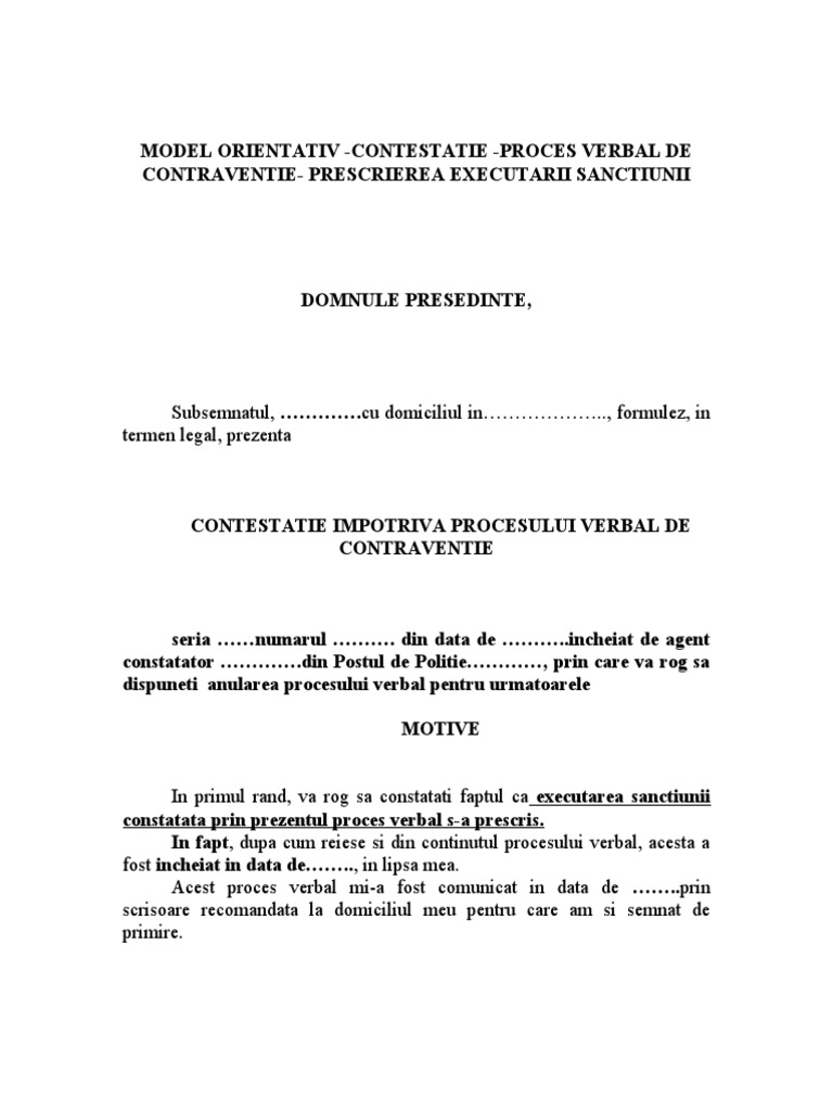 Model Contestatie Proces Verbal De Sanctionare Prescrierea Executarii